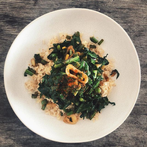 300g (Vollkorn-)Reis, geröstetes Sesamöl, 200g Räuchertofu, 1 große Zwiebel, fein gewürfelt, 3 große Karotten, ungewaschen, 500g Blattkohl, 1 Knoblauchzehe, in feine Scheiben oder Würfel geschnitten, 1 Stück Ingwer, fein gewürfelt, 1 TL Gemüsebrühenpaste, Sojasauce , Salz, Pfeffer, gerösteter Sesam oder Gomasio, wer mag: Chilipaste