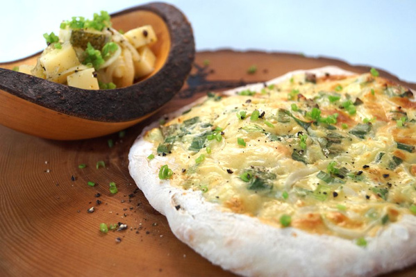 300g würzigen Käse z.B. Emmentaler, 1 Zwiebel, 4 EL Weißweinessig, 1 EL Sonnenblumenöl, Salz, Pfeffer