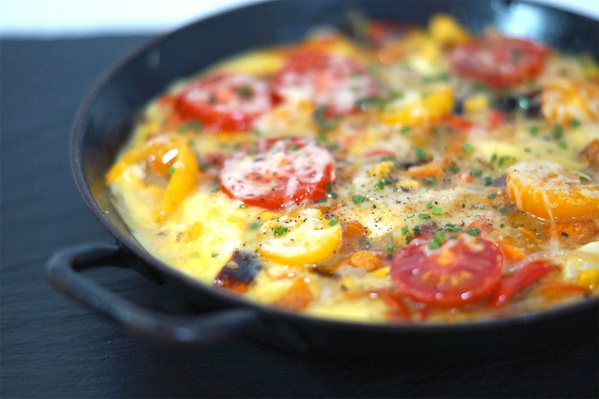 Die Eier in die Pfanne geben, alles kurz verrühren, den Kümmelkäse darüber reiben und für 20 Minuten in den Backofen bei 120 Grad geben. Schnittlauch fein hacken, evtl. nachwürzen und genießen.