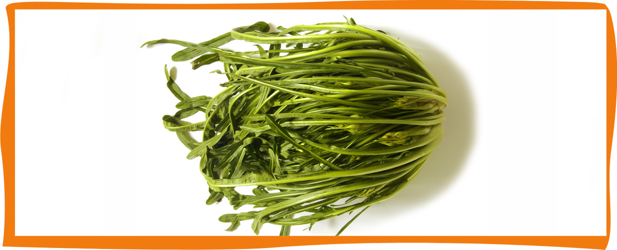KI generiert: Bündel frisches Gemüse (Barba di Frate) auf weißem Hintergrund mit orangefarbenem Rand.