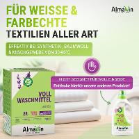AlmaWin heavy-duty detergent is characterized by its excellent washing power from 30 °C. A washing power booster made from active oxygen removes even difficult stains and prevents white laundry from turning gray. It contains GMO-free enzymes and rice starch and ensures good grip and easy ironing.suitable for all white and color-fast textiles, except wool and silk.the AlmaWin heavy-duty detergent is certified by ECOCERT and dermatologically successfully tested. It contains no synthetic fragrances, colorants or preservatives and is free from phosphates, chlorine and optical brighteners. This guarantees good skin compatibility.