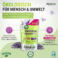 AlmaWin universal detergent with a wonderfully fresh lavender scent is suitable for all white and colored textiles, except for wool and silk. Please follow the care and cleaning instructions of the textile manufacturer. Tip: For bright white laundry, add AlmaWin oxygen bleach.