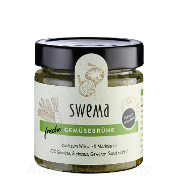 SweMa – Das Suppengrün im Glas Das alltägliche Kochen soll schnell, einfach, lecker und vor allem gesund sein. Häufig fällt dann beim Abschmecken der Gerichte der Satz: „irgendwas fehlt da noch“. Passend dafür hat SweMa eine frische Bio-Gemüsebrühe als echte Alternative zur Pulverbrühe, den Brühwürfeln und den flüssigen Bouillons entwickelt, um im Handumdrehen den täglichen Gerichten einen echten und natürlichen Grundgeschmack zu verleihen. Was ist anders als bei allen anderen: SweMa verwendet nur rohes, frisches Gemüse, Steinsalz zur Konservierung und ausgesuchte Gewürze.