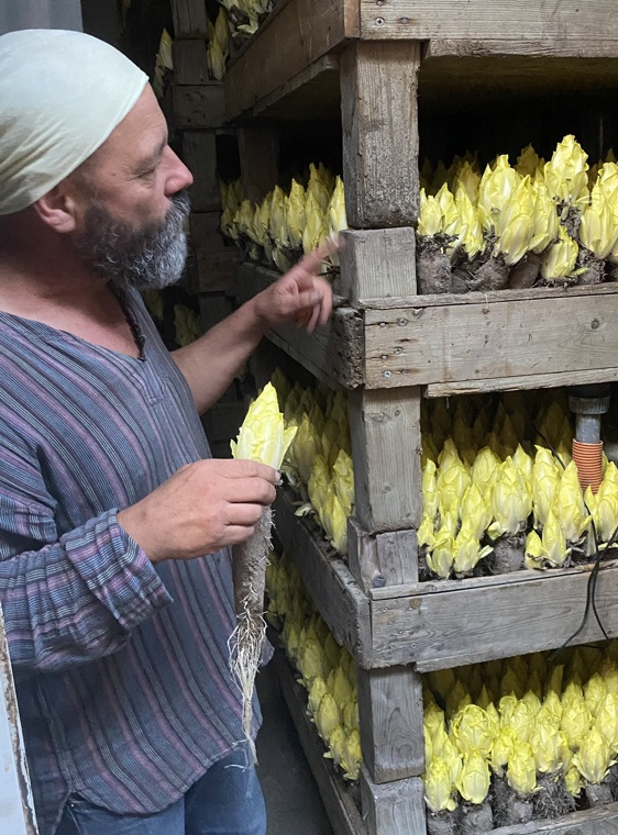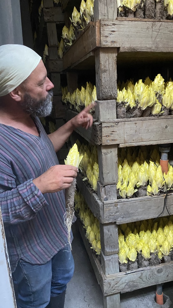 Pünktlich zur kalten Saison kommt auch der Chicorée zurück. Er mag es besonders dunkel, denn Chicorées sind Kellerkinder. Die auf dem Feld gezogenen Rüben treiben im Winter in Wasserkästen in dunklen Treibhäusern. Am Obergrashof konnten wir sehen, wie sie hinter einer großen Holztür wachsen.
