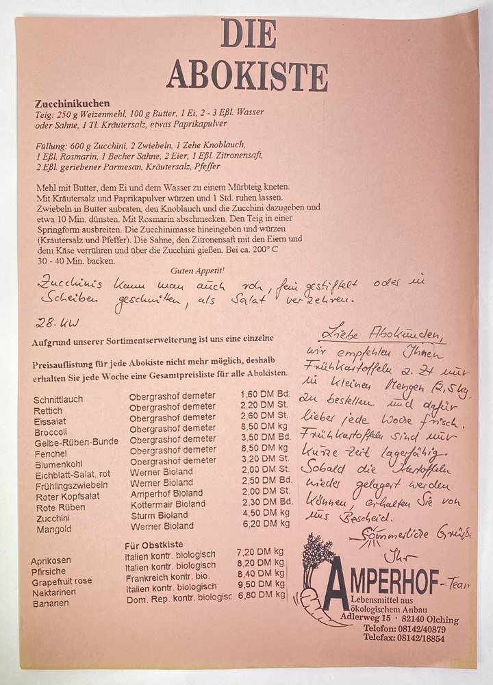 Daher sind wir etwas traurig, weil eine spannende Zeit zu Ende geht. Die ursprüngliche Idee des Kundenbriefes war ein Infoschreiben an alle Kistenempfänger, um sie über den Inhalt der Kiste aufzuklären inklusive Warenkunde für seltenes oder vergessenes, regional und saisonal angebautes Gemüse sowie passende Rezepte dazu. Heute sind Biokisten nicht mehr standardisiert und über den Online-Shop flexibel individualisierbar.