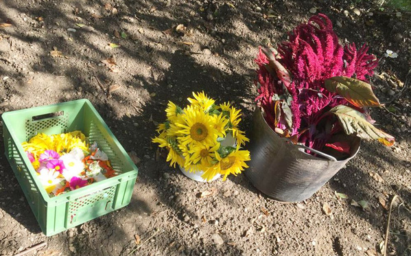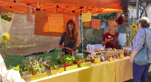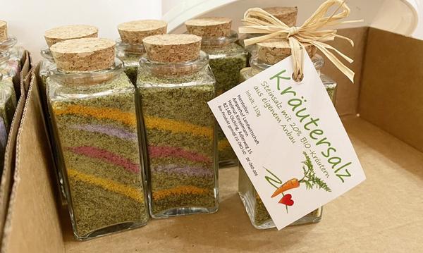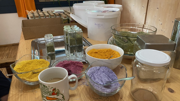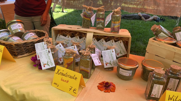 Ob Tee aus Blütenblättern, regenbogenfarbiges Kräuter-Salz (ab Winter wieder im Shop), Wildkräutersalz oder Topfpflanzen mit Wirkung - hier gab es so einiges zu erfahren und zu entdecken. An der gleichen Stelle war auch der Treffpunkt für die Hofführung mit Helmut Kinzelmann und die Kräuterführung.
