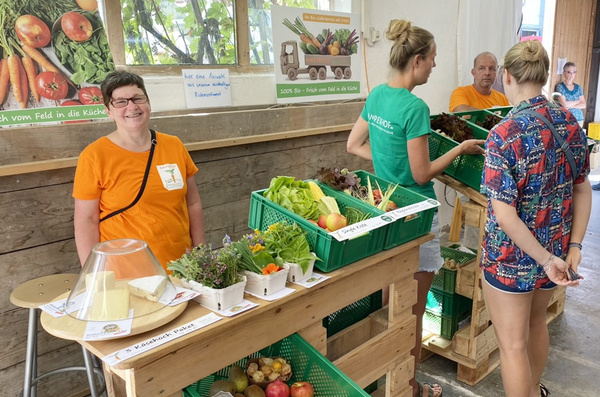 Sonja vom Obergrashof steht hinter dem hofeigenen Gemüse, das sie vor Ort verkaufte und über das sie gerne ins Gespräch kam.