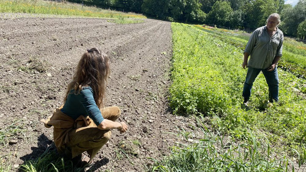 Helmut erhält den natürlichen Kreislauf am Amperhof, indem er die Böden nur minimal bearbeitet, z.B. mit einer Hacke, die nur oberflächlich arbeitet. Oder anstelle des bekannten Pflügens, das tief in die Bodenschichten eingreift, hilft ihm der Geohobel, die oberen Schichten zu bearbeiten. Diese flache Bodenbearbeitung erhält bspw. die Lebensräume der Regenwürmer. Diese bauen tatsächlich nur 1-2 Mal in ihrem Leben ein Loch in der Erde und bleiben darin viele Jahre. Würde das Zuhause des Regenwurmes zerstört, müsste er das Weite suchen, neu bauen oder würde dabei getötet.