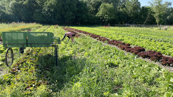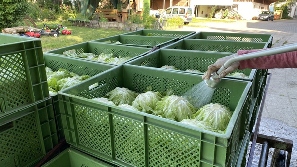 Die würzigen Amperhof-Salate sind erntereif und werden die nächsten Wochen zügig für Ihre Ökokiste geschnitten. Grüne Kopfsalate, Eichblattsalate in rot und grün, Eissalate und Radicchio gehören dazu. Tatsächlich verhalf das wechselhafte Wetter zu einem rasanten Wachstum und die Felder sind voll mit großen Salatköpfen. Dieses Jahr wachsen sie besonders dicht. Statt in drei Reihen haben Helmut, Conny und Kollegen die zarten Salatpflanzen in vier Reihen nebeneinander gesetzt. So soll verhindert werden, dass durch Starkregen die Köpfe verschmutzen. Die Salate werden nach der Ernte gewaschen, bevor sie von der Landwirtschaft an die Packhalle der Ökokiste weitergegeben werden.