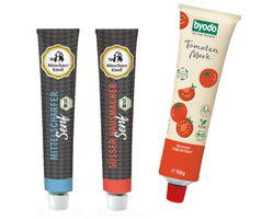 Süsser und mittelscharfer Senf von Münchner Kindl und Tomatenmark von Byodo.