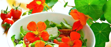 Wechselnde Mischung je nach Saison. Aktuell mit Kapuzinerkresse, Borretsch, Liebstöckl, Ysop, Schnittlauch, Estragon.
