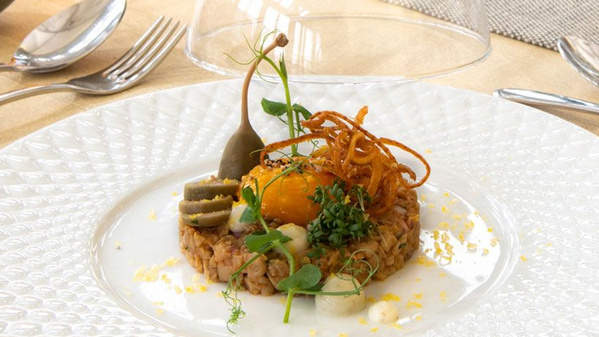 Eingekochte Aprikosen mit 1 EL Wasser, Weißweinessig, Salz und Pfeffer cremig anrühren.