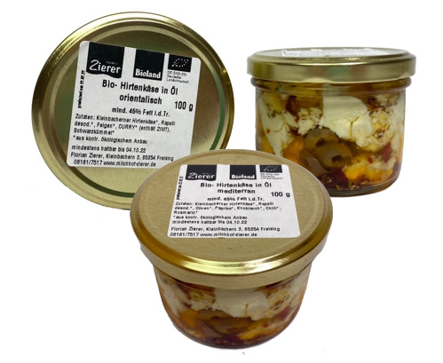 Von unserem Milch- und Joghurt-Lieferanten Zierer gibt´s jetzt auch Käse im Glas. Der Kleinbacherner Hirtenkäse ist auf zwei Arten in Rapsöl eingelegt:
