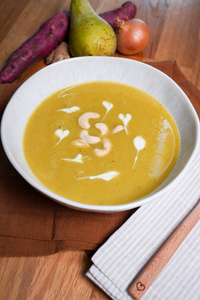 1 reife Mango oder 2 Espressotassen Mangomark, 1 reife Birne, 1 reife Banane, 2 cm frischer Kurkuma, 1 cm frischer Ingwer, eine Prise schwarzer Pfeffer, 1 EL natives Öl, (z.B. Kokos- oder Olivenöl) etwas Wasser