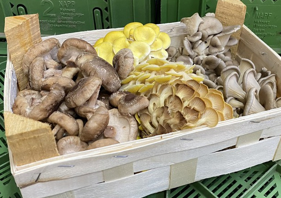 Diese feine Mischung aus drei wechselnden Sorten wie Limonen-, Rosenseitlingen, Kräuterseitlingen, Buchenpilzen, Shitake oder Austernpilzen kommt von Pilzgarten - einem BIO-Edelpilz-Zuchtbetrieb.