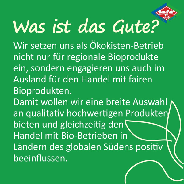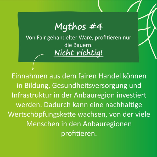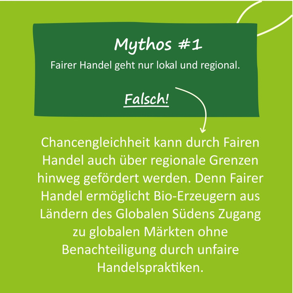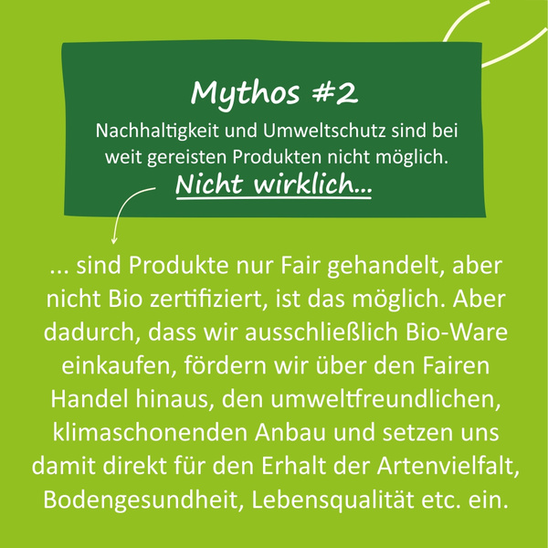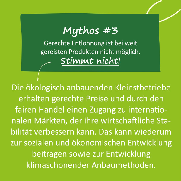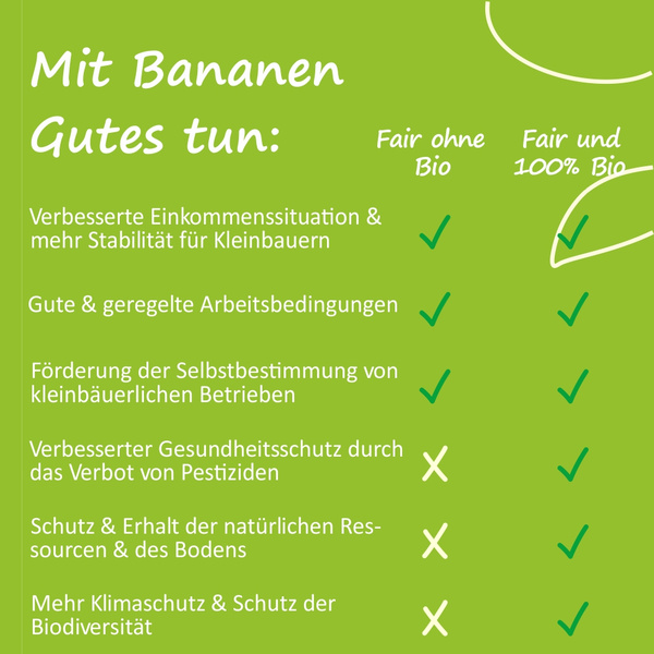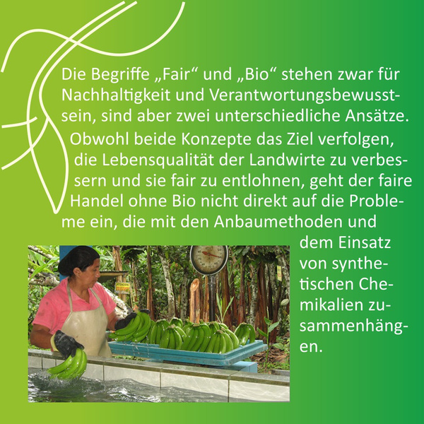 Es lohnt sich genau hinzuschauen, wo Produkte herkommen und unter welchen Bedingungen sie produziert werden: Um 100% nachhaltig zu sein, sollten im Werteverständnis der Erzeuger und Konsumenten faire Handelspraktiken mit ökologischen Anbaumethoden kombiniert werden. Denn es ist zwar lobenswert, wenn Erntehelfer fair entlohnt werden, aber beim konventionellen Anbau z.B. in Feldern stehen, auf denen giftige Pestizide und Herbizide verwendet werden, mit denen sie in Kontakt kommen.