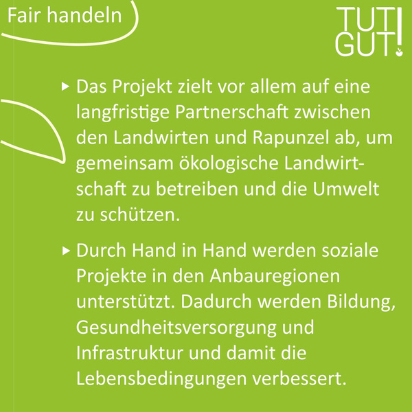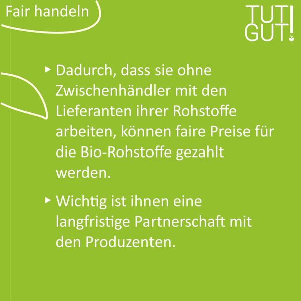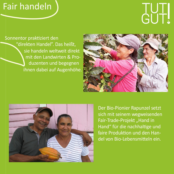 Es gab und gibt aber auch Unternehmen, die immer schon fair gehandelt haben und die faire Handelsbeziehungen auf Augenhöhe zum Grundsatz ihrer Firmenphilosophie definiert haben. Einige dieser Pioniere wollen wir Ihnen in diesem TUTGUT! Monat vorstellen und damit ihre Vorbildfunktion hervorheben und ins richtige Licht setzen. Das sind zum Beispiel Rapunzel und Sonnentor, aber auch viele weitere Firmen, die Sie bei uns im Sortiment finden. Zertifizierungssiegel oder Programme wie Fairtrade, UTZ-certified, Rainforest Alliance, We care, Hand in Hand oder auch das Gemeinwohlsiegel schaffen ebenfalls Transparenz.