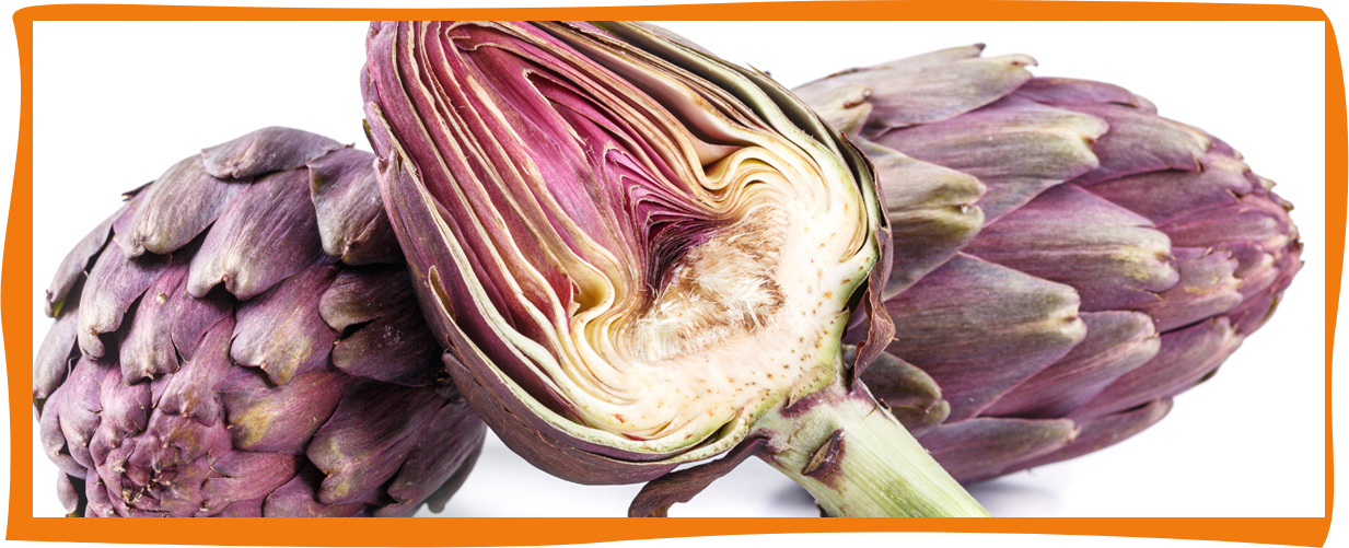 KI generiert: Das Bild zeigt drei Artischocken, von denen eine in der Mitte durchgeschnitten ist, um das Innere zu zeigen. Die äußere Umrandung des Bildes ist orange.