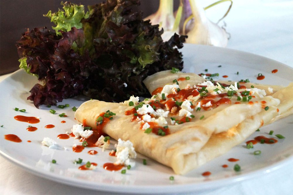 In die Pitulizi die Auberginen-Creme streichen, einklappen und mit dem Schnittlauch, Knoblauch und Schafkäse beträufeln. Zum Schluss die Solilo-Soße darüber verteilen und zusammen mit dem Salat genießen.
