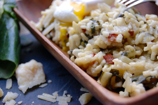 Risotto anrichten, wenn gewünscht Postelein und/oder Parmesan darüber streuen und jeweils ein pochiertes Ei daraufsetzen.