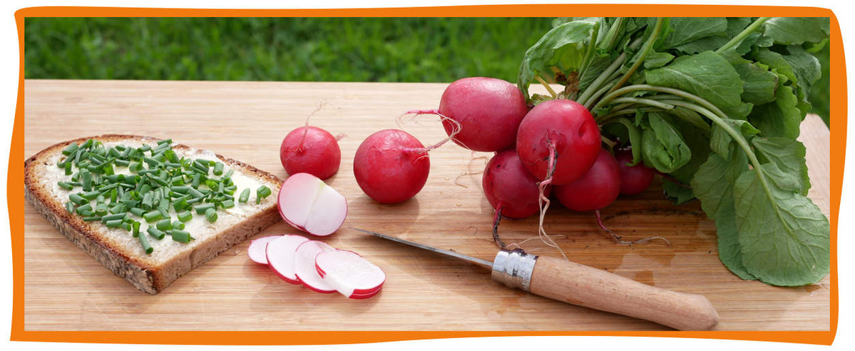In Scheiben oder Streifen geschnitten oder geraspelt werden die Knollen der Radieschen roh verzehrt. Sie können Salaten beigemischt oder aufs Brot gelegt werden. Salz mildert den etwas scharfen Geschmack. Aber nicht nur die Knolle überzeugt auf dem Teller. Auch das Blattgrün des Radieschens kann gegessen werden: Als Pesto verarbeitet gibt es Nudelgerichten ein tolles Aroma. Ihr könnt die Blätter auch ähnlich wie Spinat verarbeiten, etwa mit Zwiebeln und Knoblauch andünsten oder aber auch einer Creme-Suppe beigeben. Mehr Tipps zur Verwendung von Gemüse-Grün findet Ihr in unserem Artikel „Zu wertvoll für den Müll“.