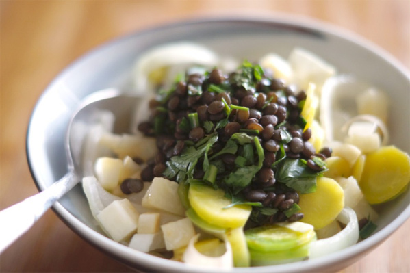 Linsen mit allen Zutaten für etwa 15–20 Minuten bissfest in einem Topf köcheln lassen.