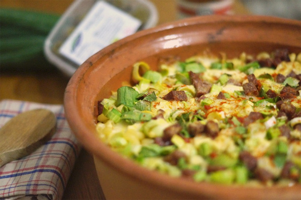 500g Hörnchen Nudeln, 3 Eier, 1 Lauch, 200g Rindersalami, 190g Salzlakenkäse Feta, 100g Ajvar, 100ml Milch, 2 EL Bratöl, 3 Frühlingszwiebel, Salz, Paprika