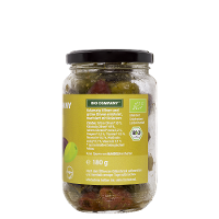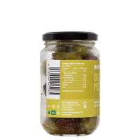 Grüne Oliven* 50 %, Kalamata Oliven* 49 %, natives Oilvenöl* extra 0,2 %, Oregano* 0,2 %, Thymian* 0,2 %, Rosmarin* 0,2 %, Weißweinessig* 0,1 %, Meersalz 0,1 %