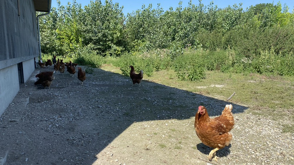 Als wir den Hof im August 2023 besuchen, zählt er 23 Kühe, 14 Kälber und über 300 freilaufende Hühner. Alle Tiere können sich frei zwischen drinnen und draußen bewegen. Die Hennen gackern aufgeregt bei unserem Rundgang und kommen aus dem schattigen Busch angeflitzt. Die Rinder genießen bei unserem Besuch das Heu im Stall, haben aber durch die spezielle Konstruktion des Gebäudes die Möglichkeit, jederzeit auf die Weide zu laufen.