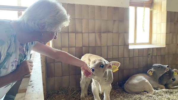 Diese Rasse mit den wuscheligen Ohren hat Simon bei seiner Arbeit auf einer Schweizer Alm kennengelernt. Dort und im Allgäu ist sie heimisch, bei uns aber nur noch selten anzutreffen, sogar gefährdet. Das Original Braunvieh aus dem Allgäu ist keine Hochleistungsrasse. Daher eignet sie sich gut für die Milch- und Fleischproduktion. Hier am Hof geht es ihnen besonders gut, z.B. werden sie ausschließlich mit Gras und Heu gefüttert. So ist es den Kühen möglich, direkt über die Nahrung wertvolle Kräuter und Vitamine aufzunehmen, welche der Milch eine außergewöhnliche Note verleihen. Dass es den Tieren gut geht, merken wir auch bei dem Kälbchen, das am Vortag geboren wurde und sich von unserer Kollegin Marita streicheln lässt.