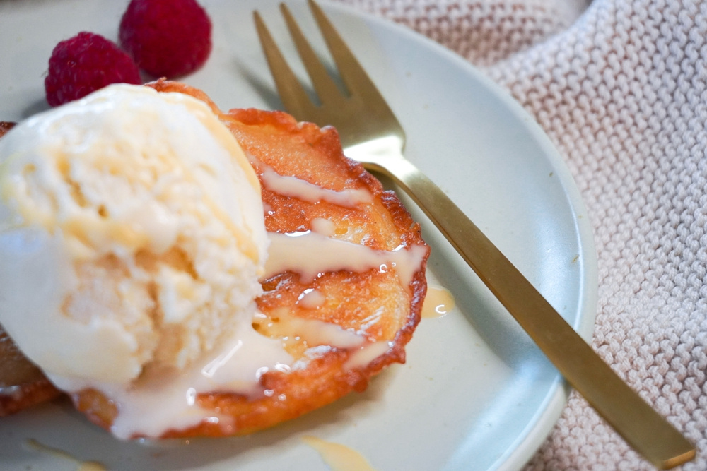 Zu den Apfelküchlein lässt sich je nach Saison frisches Obst oder ein veganes Vanilleeis, Zimt & Zucker, Puderzucker, eine leckere Joghurtalternative oder Nussmus servieren.