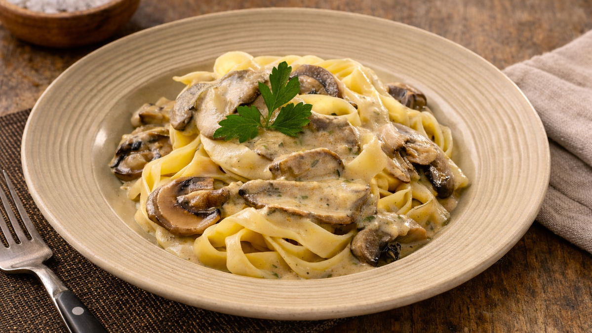Währenddessen Wasser zum Kochen bringen und die Nudeln nach Packungsanleitung garen. Alles mit Salz, Pfeffer, Muskat und Cayennepfeffer kräftig abschmecken, die gehackte Petersilie daruntermischen und die Pilze anrichten. Nudeln abseihen und dazu reichen.