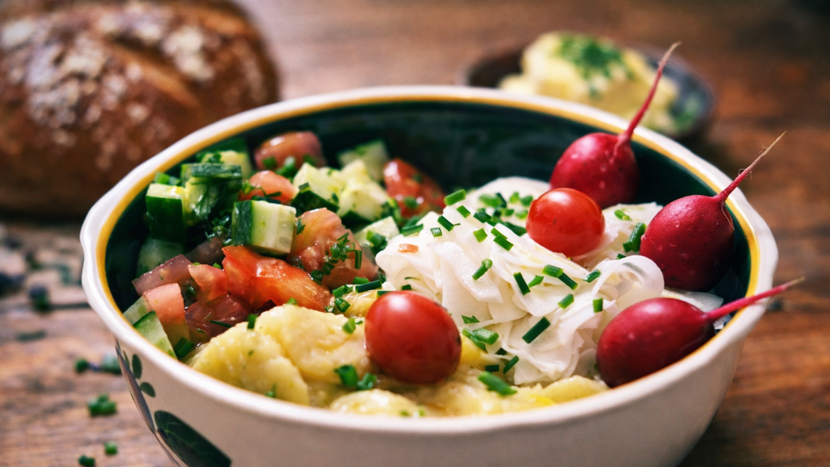 Für den Kartoffelsalat können auch bunte Kartoffelsorten verwendet werden. Sie enthalten oft mehr Vitamin C und sorgen für zusätzliche Farbe. Wer die Farbintensität erhalten möchte, kocht die Kartoffeln am besten ungeschält und schält sie erst danach.