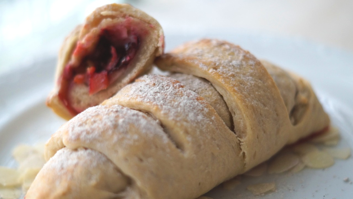 Etwas Öl auf den Blätterteig geben, so klebt er beim Einrollen nicht fest und lässt sich leichter verarbeiten.