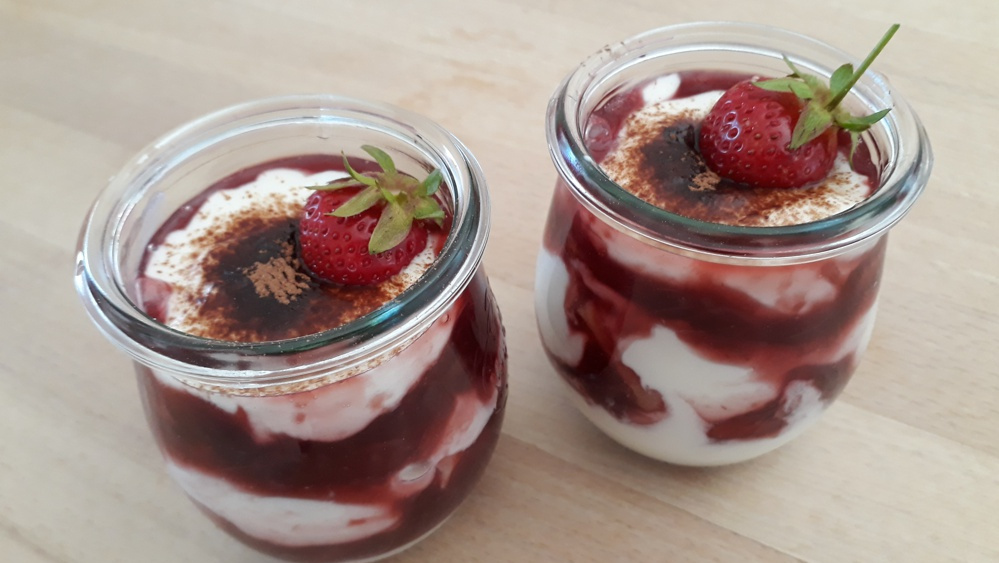 Ein paar Cantuccini oder Löffelbiskuits in kleinen Stücken in 4 Gläser geben und mit je 2 EL Espresso beträufeln. Danach 2 EL Creme und 2 EL Rhabarber-Erdbeer-Kompott darüber geben. Erneut mit Cantuccini/Löffelbiskuits belegen. Wieder 2 EL Creme und 2 EL Kompott darauf verteilen, mit der restlichen Creme abschließen.