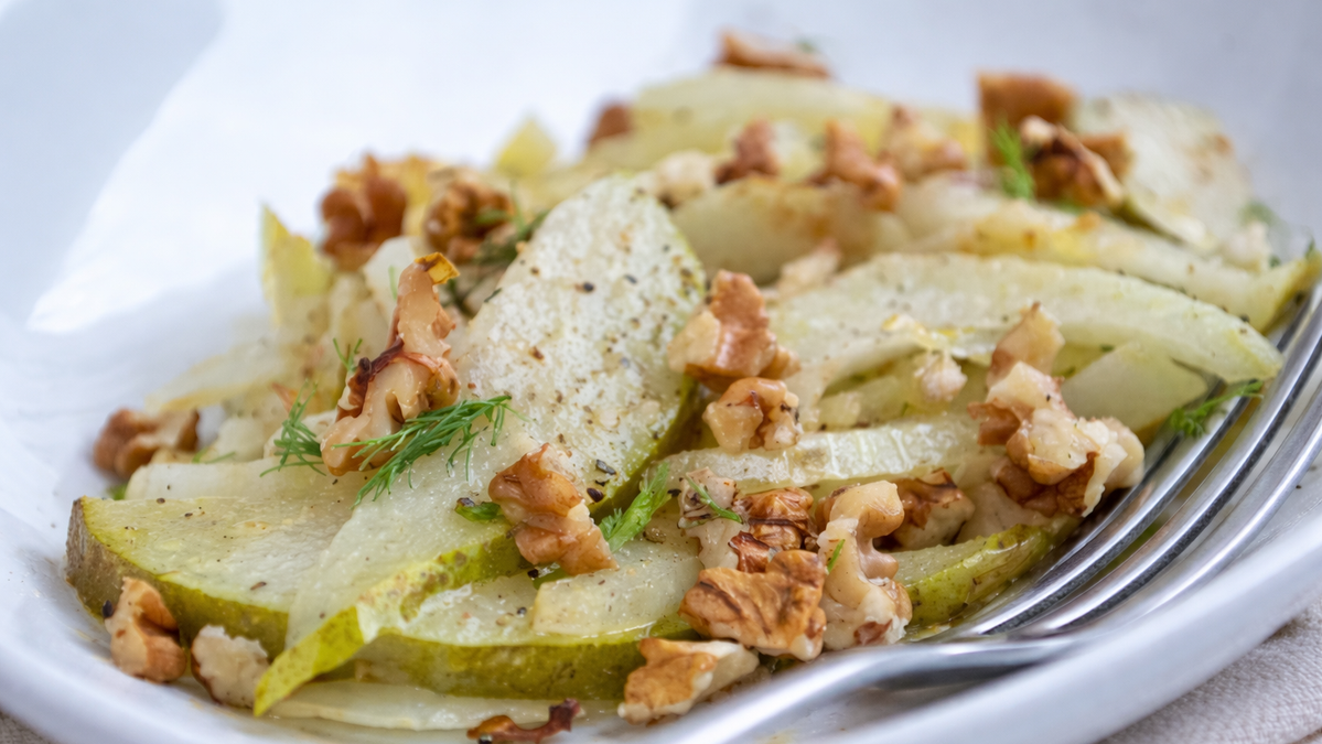 Den Salat auf einer Platte oder in einer Schüssel anrichten, mit den gerösteten Walnüssen bestreuen und nach Belieben mit dem Fenchelgrün garnieren.