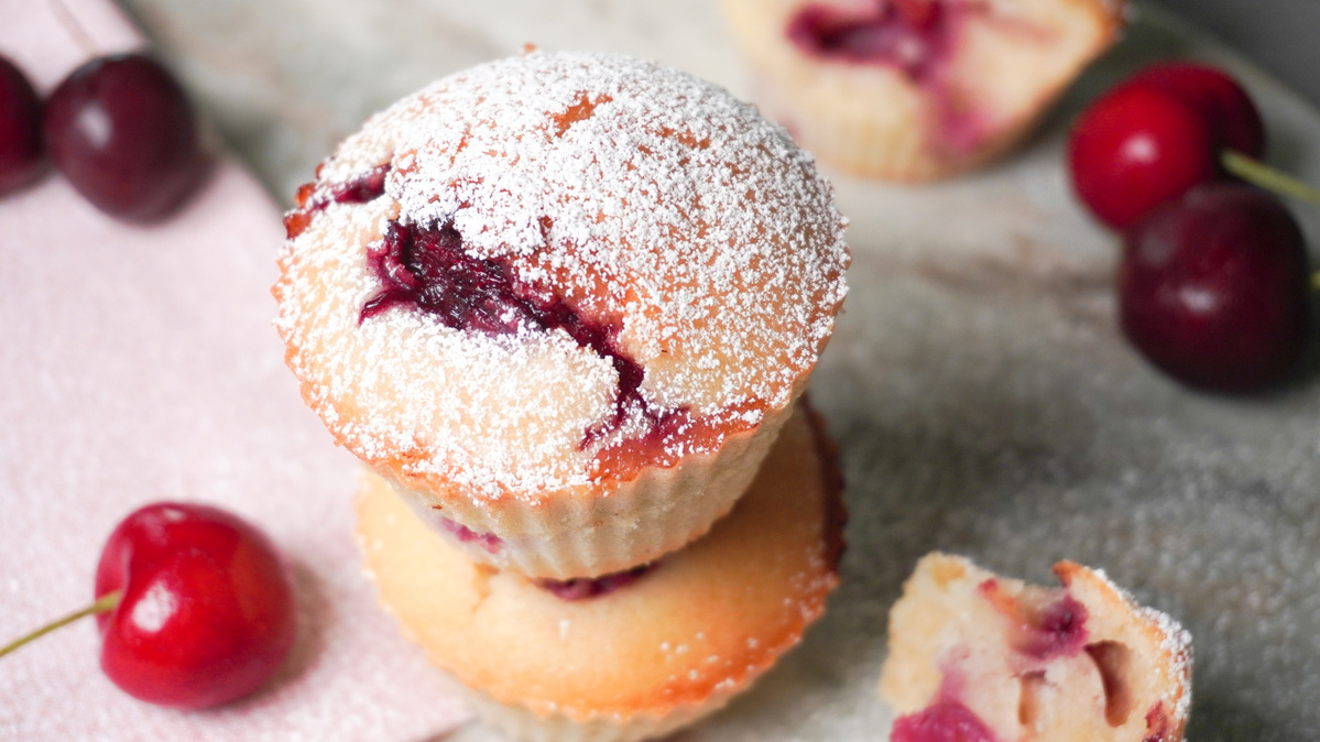 Die Kirschen waschen, Kern entfernen, am besten vierteln und unter den Teig rühren.