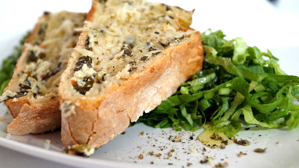 Die Kräuterrolle aus dem Ofen nehmen, für 5 Min. etwas ausdampfen lassen und in Portionen teilen. Eventuell nachwürzen und mit etwas Olivenöl beträufeln.