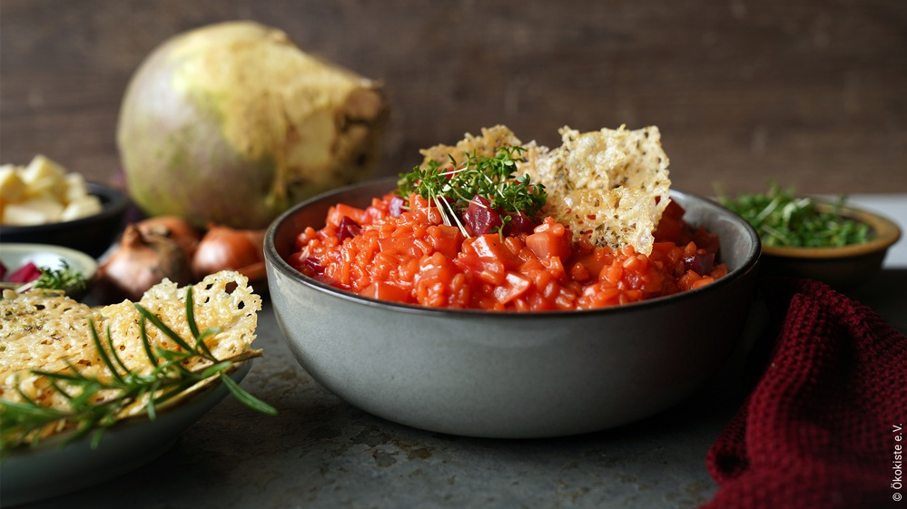 Den Backofen auf 200 °C vorheizen. Die Schalotten abziehen und fein würfeln. Knoblauchzehen ebenfalls klein würfeln. Die Rote Bete, die Steckrübe und die Möhre in ca. 1 cm große Würfel schneiden.