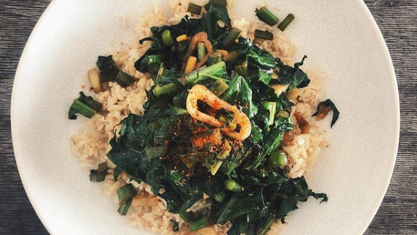 Den Blattkohl unterheben und kurz zusammen fallen lassen. Mit einem guten Schuss Sojasauce ablöschen und alles gut vermengen. Nach Geschmack mit Salz und Pfeffer abschmecken.