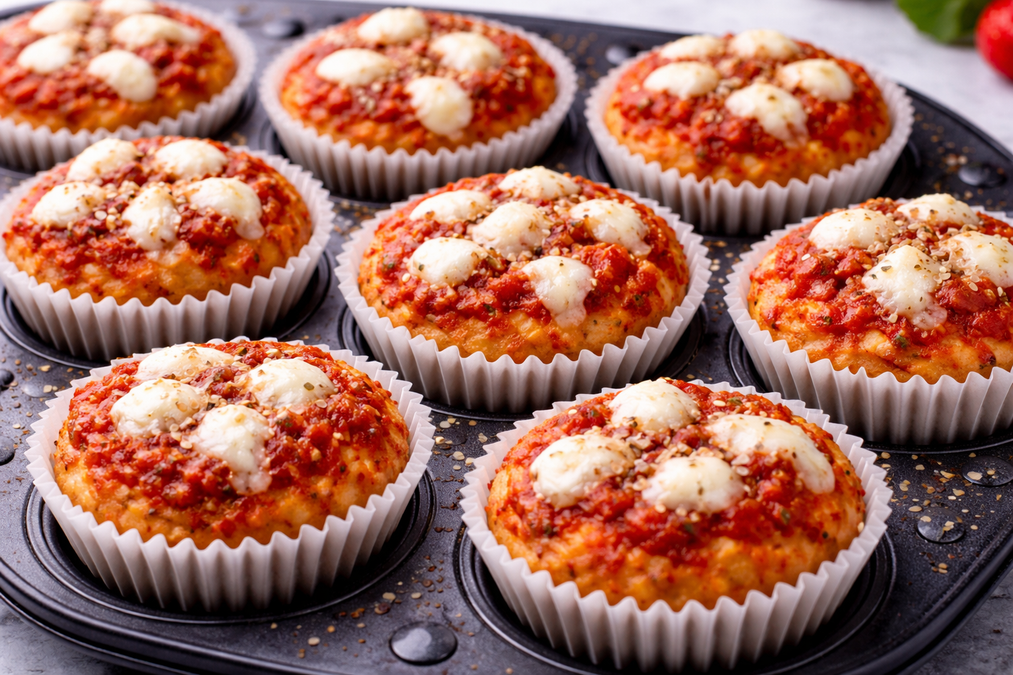 Den Teig in 12 Teile schneiden und in die Muffinform eindrücken. 2 TL Tomatensoße pro Muffin darüber geben, Mozzarella auseinander zupfen und gleichmäßig über die Muffins verteilen.