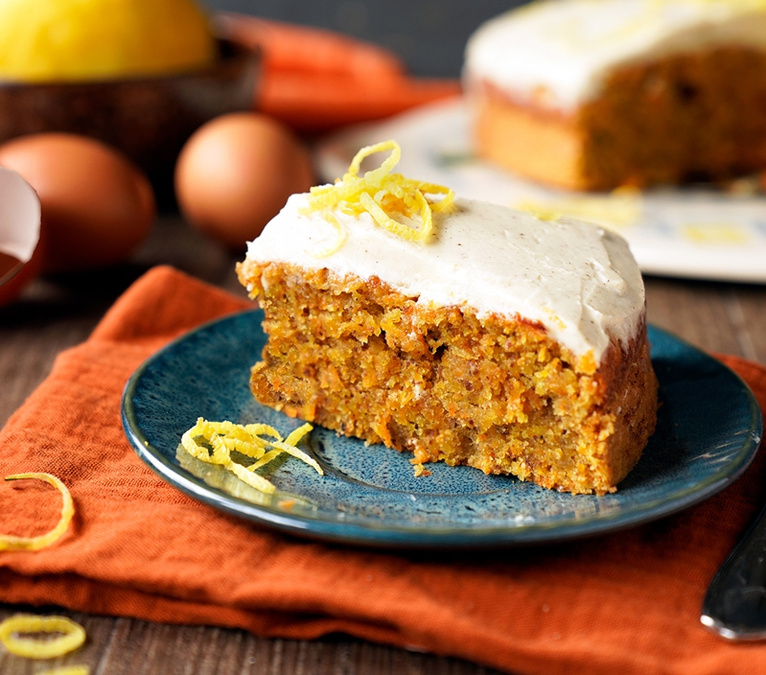 Das Frosting mit einem Messer oder einer Palette auf den abgekühlten Kuchen auftragen, mit Zitronenzesten dekorieren.