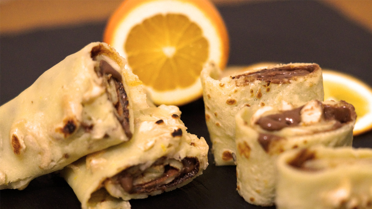 Die fertigen Pfannkuchen nach Belieben mit Haselnussaufstrich bestreichen, einrollen und warm servieren.