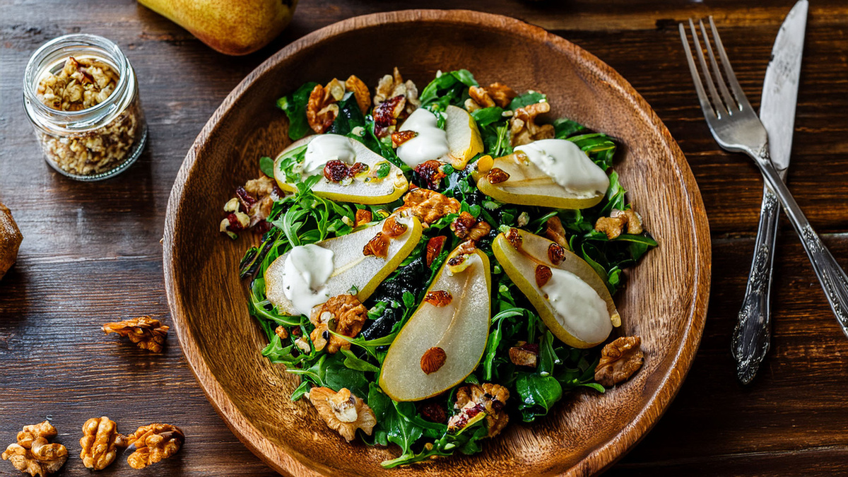 Den Postelein mit dem Dressing vermengen und auf Tellern anrichten. Die Birnenspalten darauf verteilen und die Mascarponecreme in kleinen Klecksen darübergeben. Zum Schluss mit den gerösteten Walnüssen bestreuen und servieren.