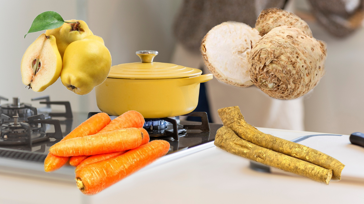 Möhren, Sellerie und Quitten in 2-cm-Würfel schneiden.