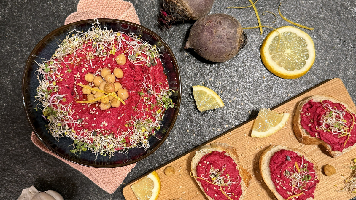 Alle Zutaten für den Hummus – einschließlich der gerösteten Roten Bete – in ein hohes Gefäß geben und mit einem Stabmixer oder High-Speed-Blender fein pürieren, bis eine cremige Konsistenz entsteht. Bei Bedarf nach und nach etwas Aquafaba hinzufügen, um die gewünschte Cremigkeit zu erreichen.