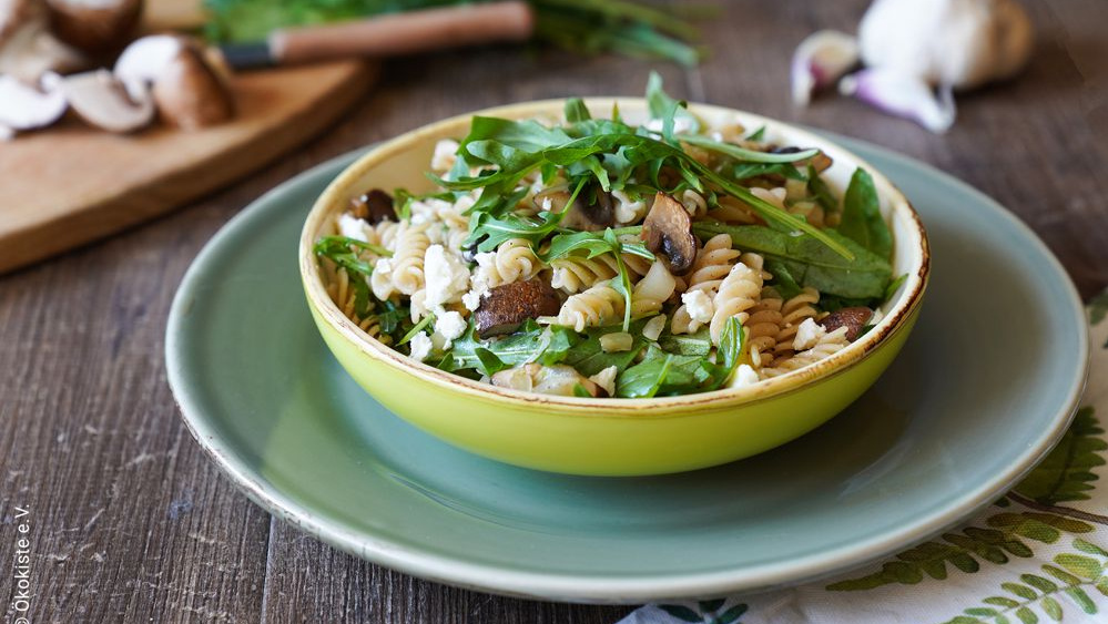 Nudeln abtropfen lassen, mit Pilzen, dem angerührten Knoblauch-Zitronenöl, Feta und Rucola vermischen, ggf. nachwürzen.