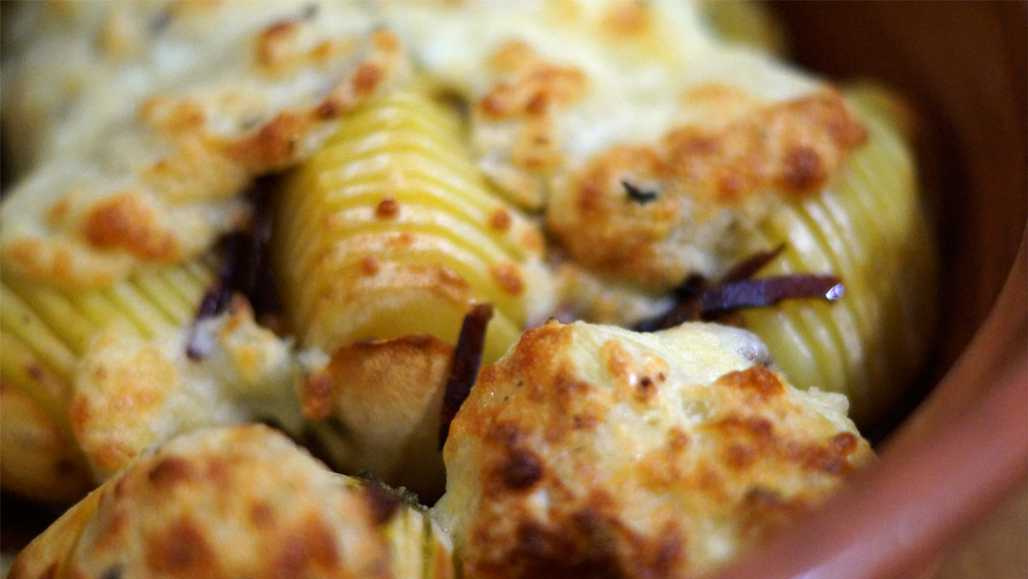 Den Backofen auf 170 Grad Umluft vorheizen. Die Kartoffeln schälen und vorsichtig in feine Fächer einschneiden, dabei darauf achten, sie nicht ganz durchzuschneiden.
