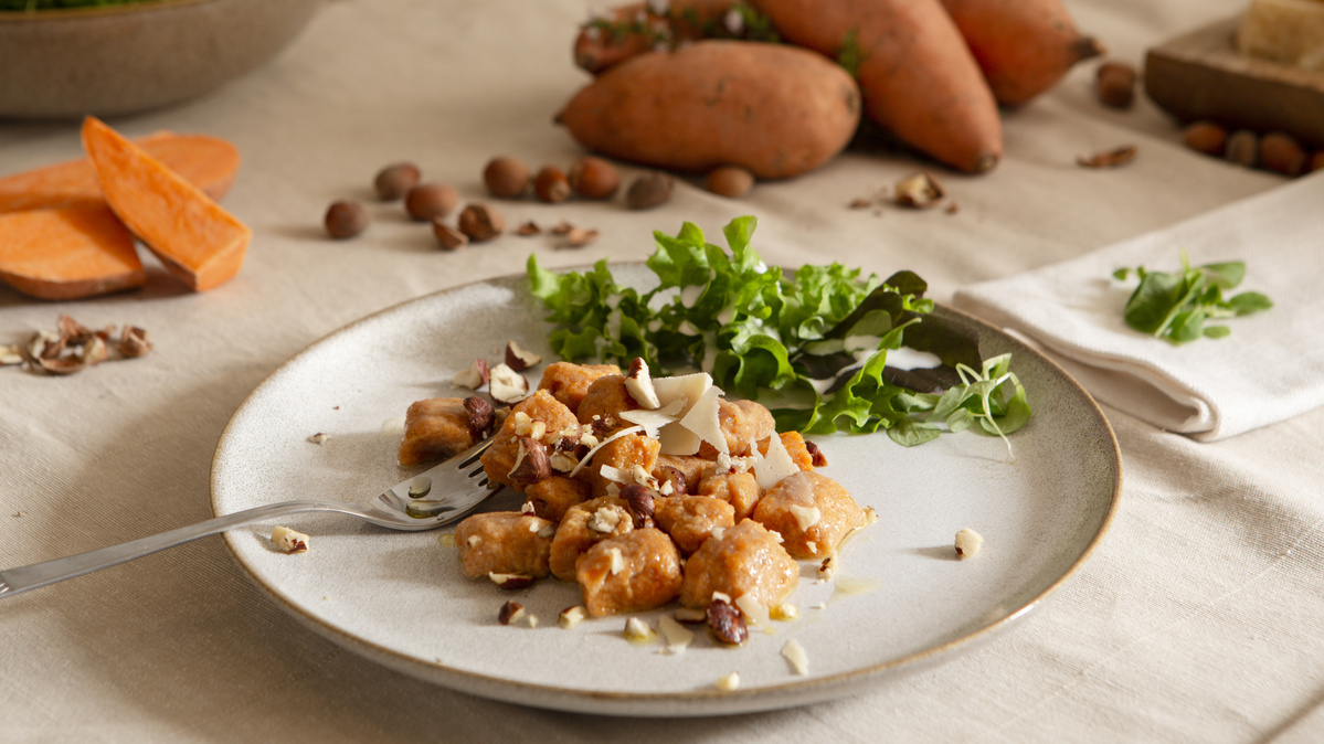 Die Süßkartoffeln schälen und entweder ganz oder halbiert in circa 20 Minuten kochen. Etwas abkühlen lassen, anschließend mit einem Kartoffelstampfer zerdrücken und weiterhin auskühlen lassen. Für die Verarbeitung sollten die Kartoffeln warm sein, aber nicht mehr dampfen.