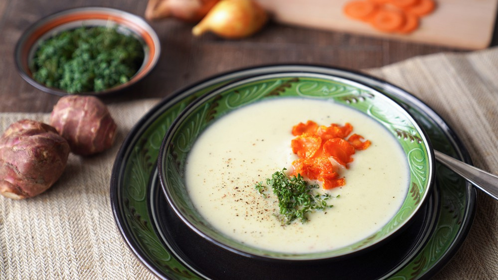 Die Butter in einem Topf erhitzen und die Schalotten darin glasig dünsten. Topinambur hinzufügen, kurz mitdünsten. Gemüsebrühe dazugeben, aufkochen und bei geschlossenem Deckel 15 Minuten köcheln lassen.